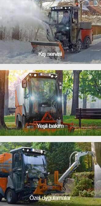 Çok işlevlilik sayesinde çoklu kullanım [...] Citymaster 650, çok yönlü bir alet taşıyıcı ve profesyonel süpürücü bir aradadır. Çeşitli ataşmanları ve ataşmanları dört bağlantı arabiriminde birleştirerek, birçok başka görevi üstlenebilir: örneğin kış servisi, yeşil bakım veya ıslak temizlik. Daha fazla verimlilik ve ekonomi için birkaç özel araç yerine bir makine yeterlidir.